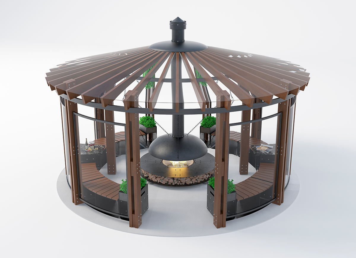 Внутри: очаг или кострище, тандыр, радиусные скамейки,система удаления дыма,любое наполнение и оборудование