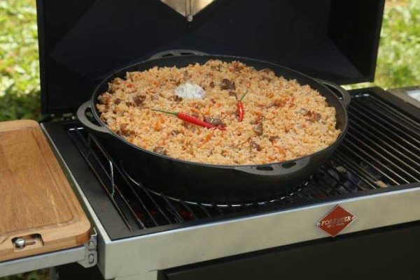 Чугунный казан с крышкой-сковородой Forester CI-01 – универсальное решение 2 в 1. Оба эти изделия имеют плоское дно, поэтому в них можно готовить не только на мангале, но и на электрической и газовой плитах. В производстве чугунного казана Форестер на 9 л использован метод литья, благодаря которому его поверхность практически гладкая. При температурной и жировой обработке пористая структура чугуна создает естественный антипригарный слой. Отличная теплоемкость и низкая теплопроводность этого материала обеспечивают равномерное распределение тепла. К тому же, пища в нем долго остается горячей даже после окончания приготовления. Казан на 9 литров идеально подходит для приготовления блюд на большую компанию отдыхающих.