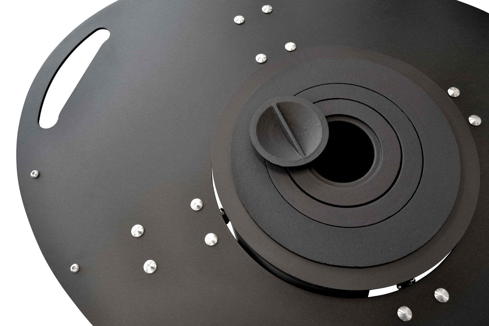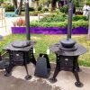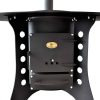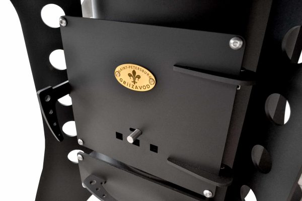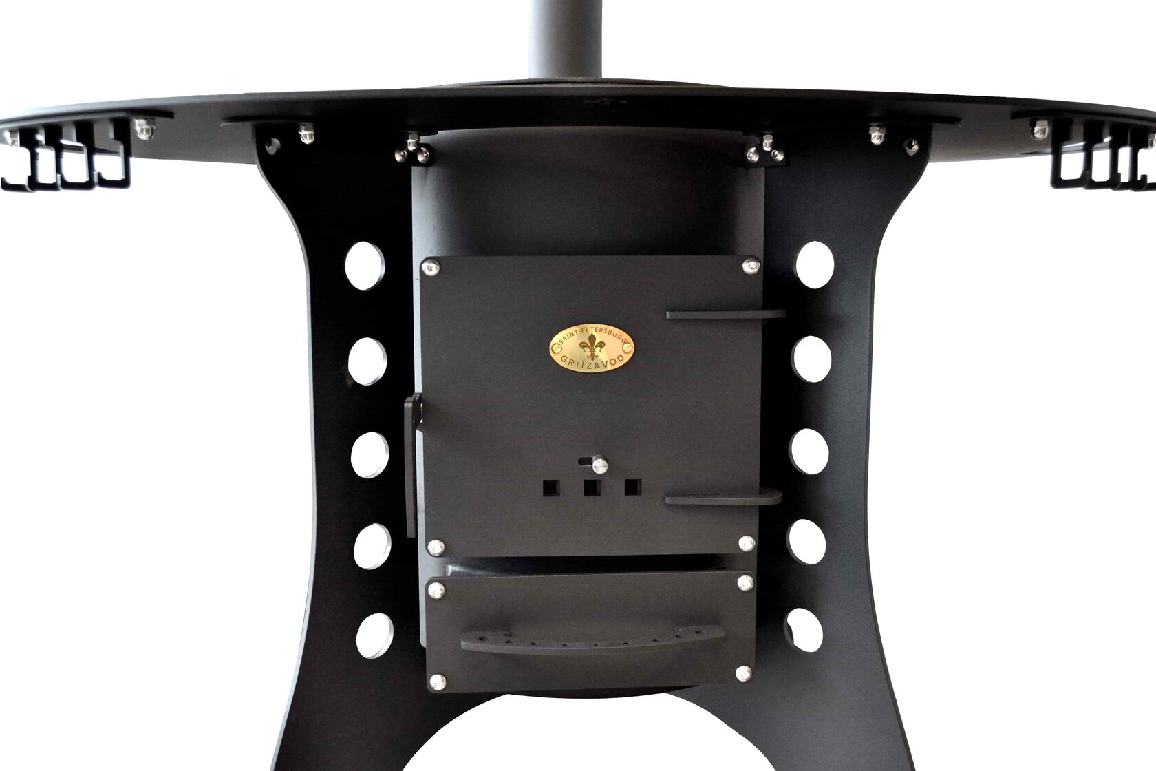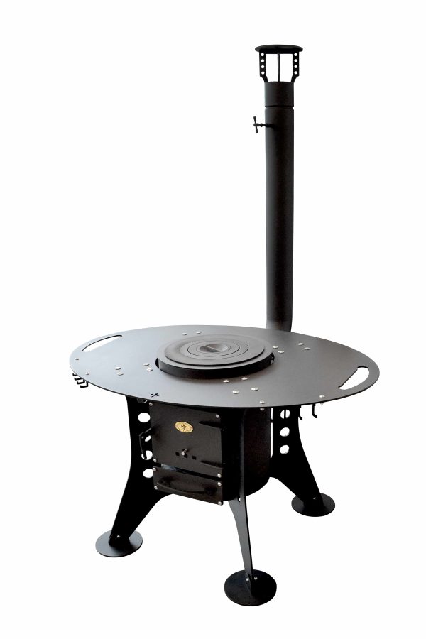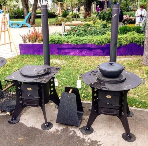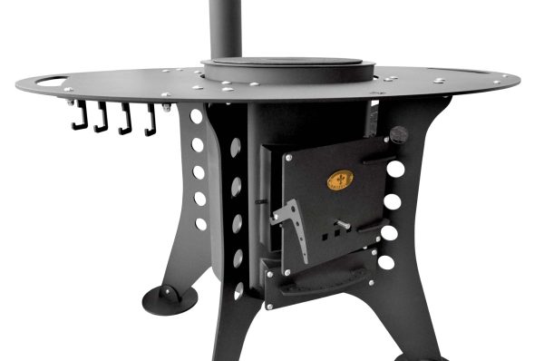 В комплект входят: труба с зонтиком, колосниковая решётка, выдвижной зольный ящик, он нужен не только для удаления золы, но и для регулировки интенсивности горения. Над очагом установлены чугунные конфорки под казан.