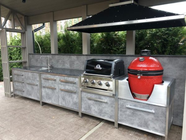 12Модуль стол это практичный, надежный вариант для уличной кухни с гранитной поверхностью и большими размерами столешницы. Сделан из сверхпрочных материалов. Каркас из нержавеющей стали AISI 304 профильная квадратная труба 30х30мм. Стенки, фартук и фасады кухни из HPL панели (High Pressure Laminate) — листы из очень твердого, плотного материала, со стойкой защитой от воздействия ультрафиолета, выцветания и воздействия осадков, перепадов температур, долговечный, ударопрочный, не подверженный царапинам материал.