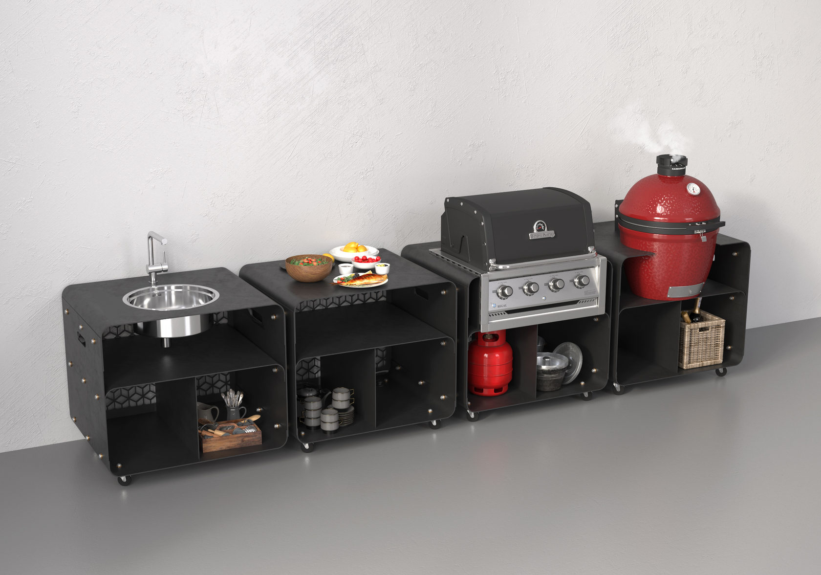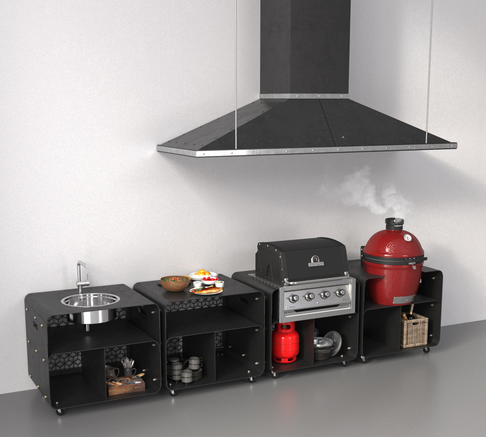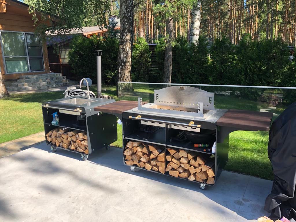 Все модули изготовлены из сверхпрочного металла и покрыты высококачественной порошковой краской. Выдерживают температуру до 200°С. Мобильное и лёгкое передвижение по участку обеспечивают колесики со стопорным механизмом. Имеются полки для хранения кухонной утвари. Задняя стенка модуля выполнена в виде декоративной решётки.