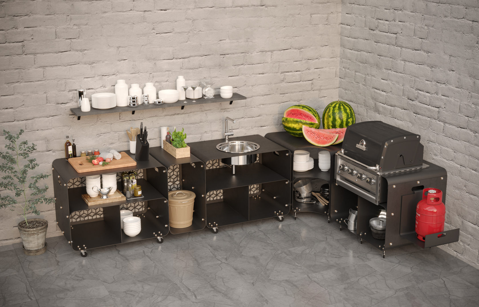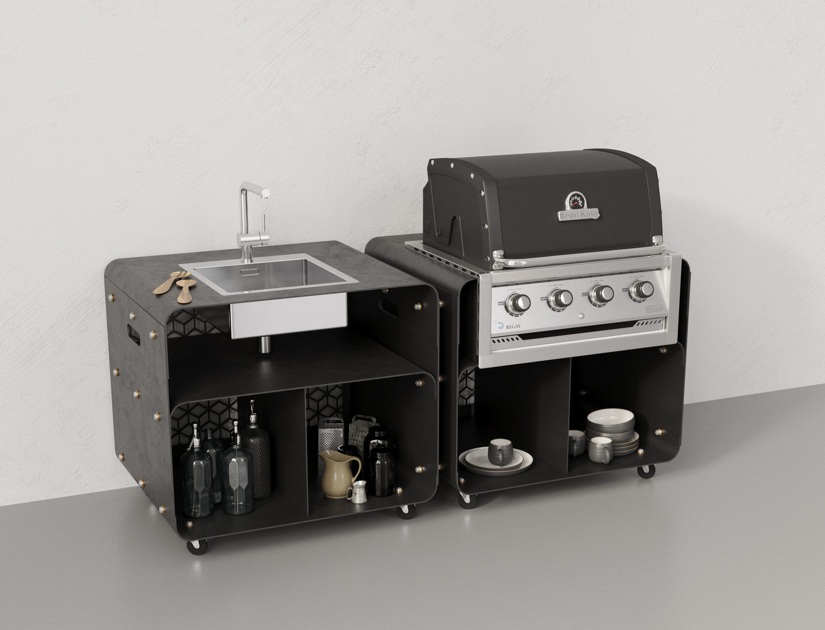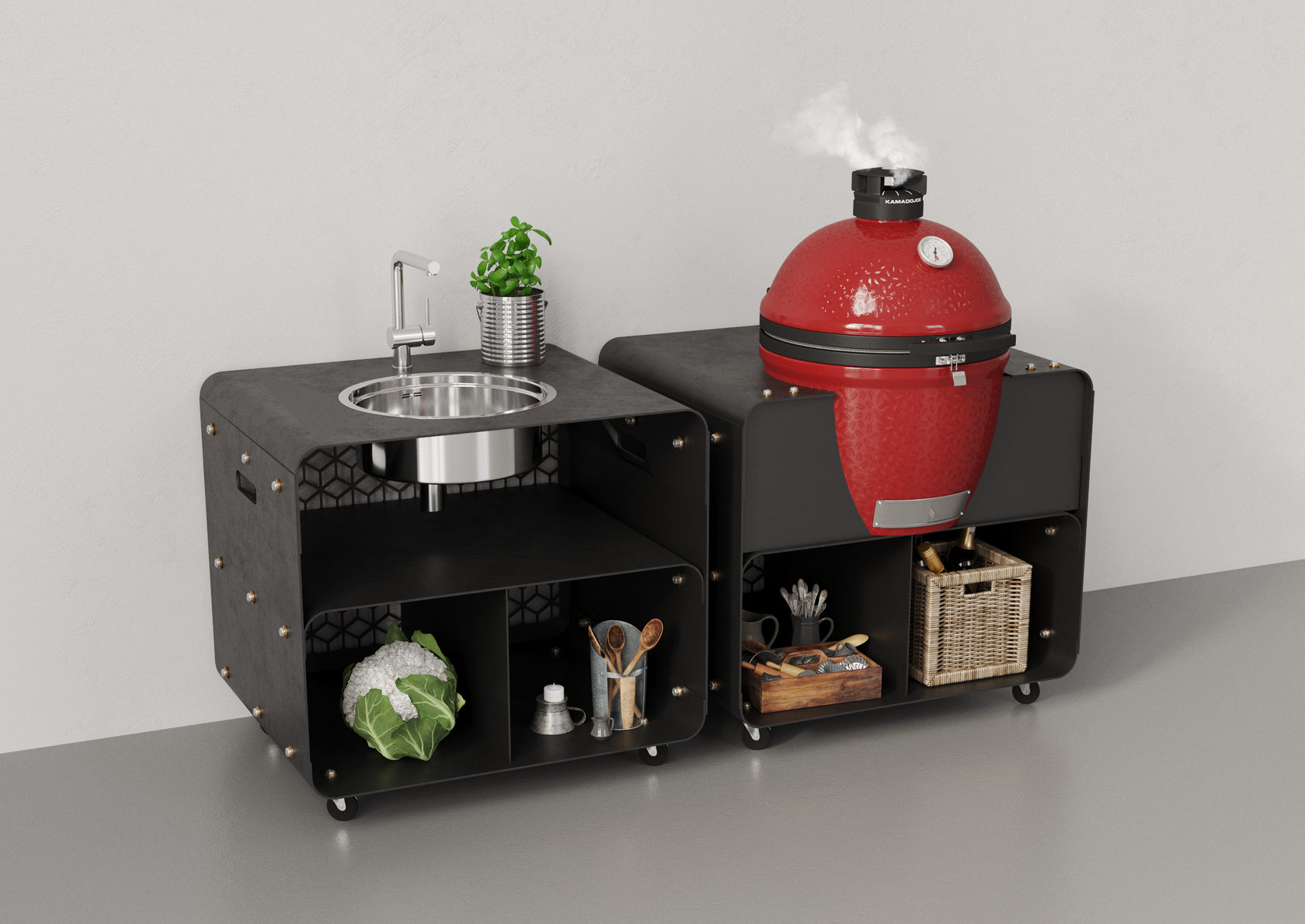 Все модули изготовлены из сверхпрочного металла и покрыты высококачественной порошковой краской. Выдерживают температуру до 200°С. Мобильное и лёгкое передвижение по участку обеспечивают колесики со стопорным механизмом. Имеются полки для хранения кухонной утвари. Задняя стенка модуля выполнена в виде декоративной решётки.
